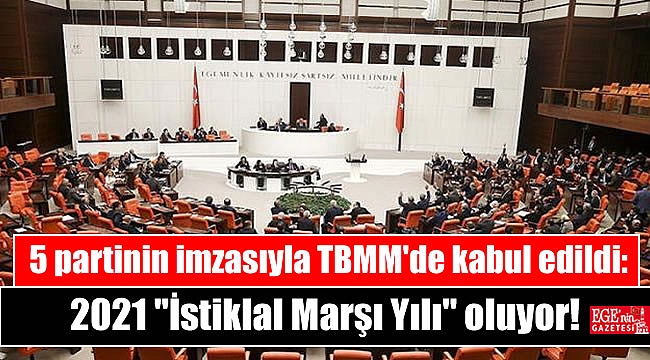 TBMM Genel Kurulunda, Meclis Başkanı Mustafa Şentop'un ilk imza sahibi olduğu ve AK Parti, CHP, HDP, MHP ve İYİ Parti'nin imzasının yer aldığı önergeyle, 2021 yılının "İstiklal Marşı Yılı" olmasını içeren düzenleme kabul edildi.Türkiye Çevre Ajansının Kurulması ile Bazı Kanunlarda Değişiklik Yapılmasına Dair Kanun Teklifi'nin görüşmeleri sırasında, Meclis Başkanı Şentop ile AK Parti, CHP, HDP, MHP ve İYİ Parti ortak önerge verdi. Yapılan oylamada önerge kabul edildi. Bu kapsamda İstiklal Marşı'nın Kabul Edildiği Günü ve Mehmet Akif Ersoy'u Anma Günü Hakkında Kanun'a geçici madde eklenmesini içeren düzenleme kanun teklifine eklendi.