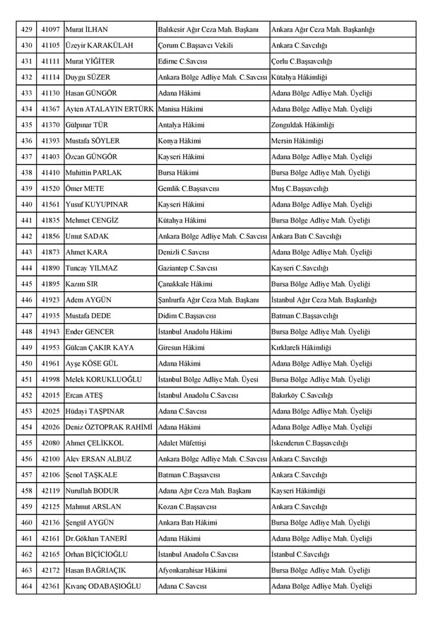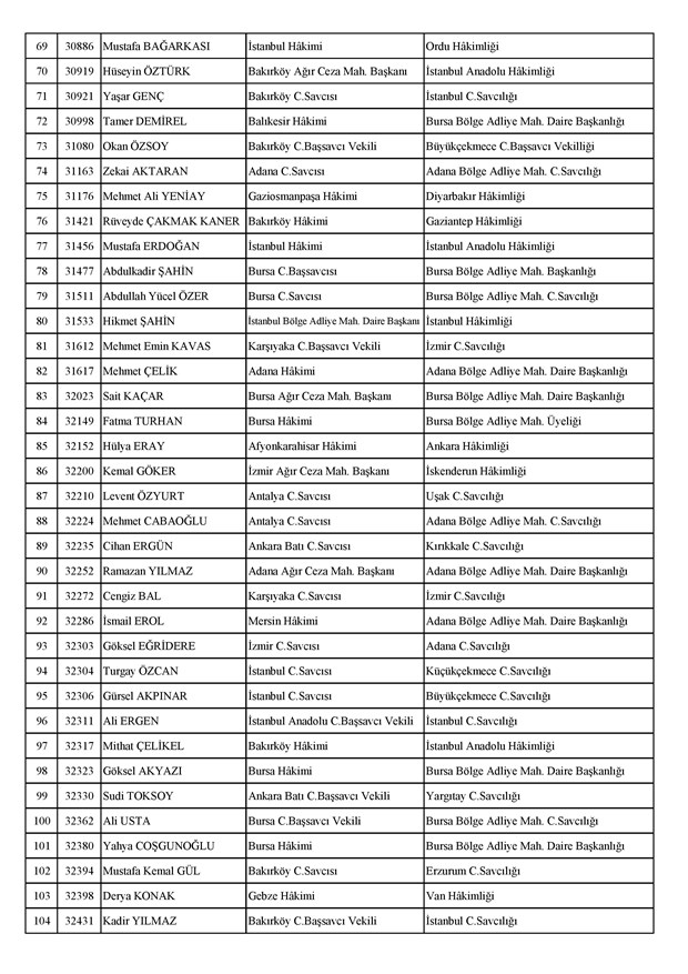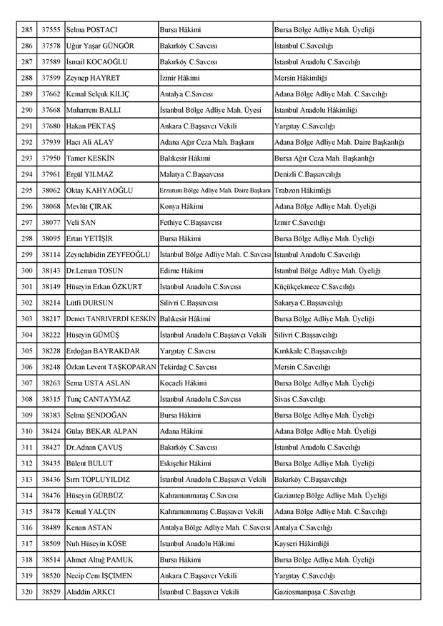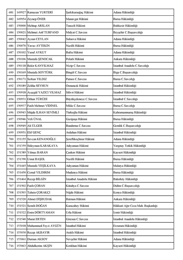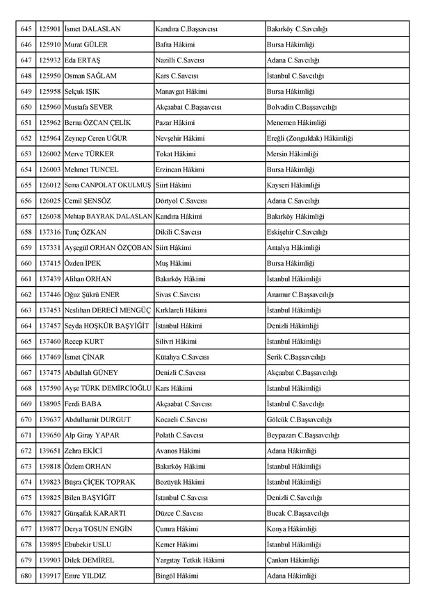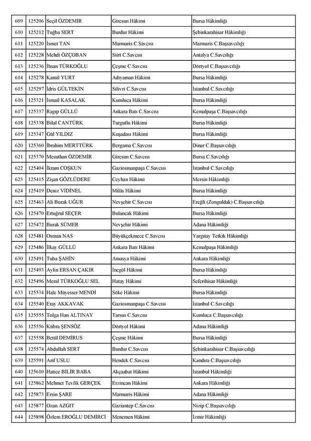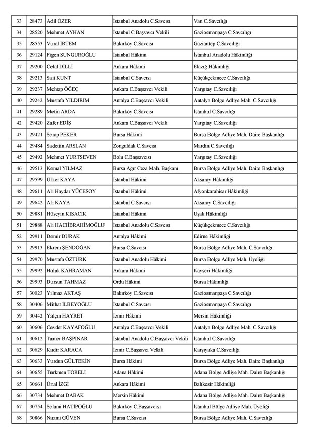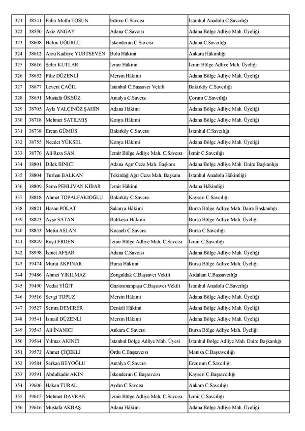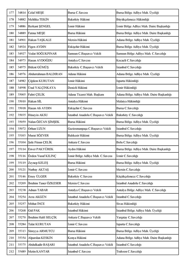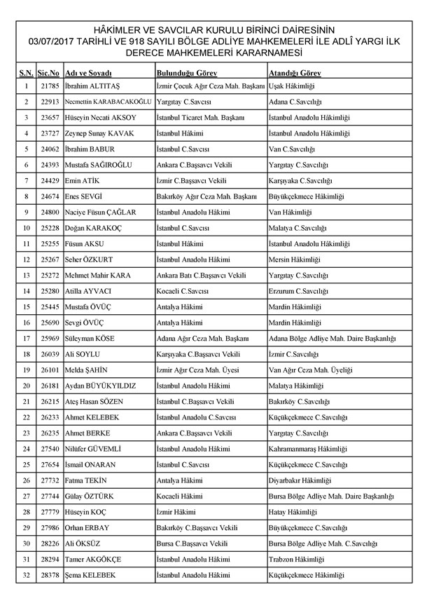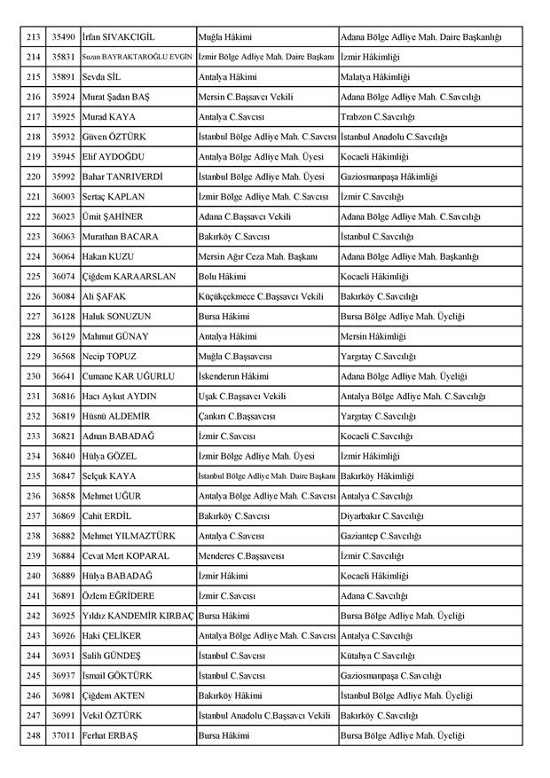 Ataması yapılan meslektaşlarımıza yeni görev yerlerinde başarılar diler, kararnamelerin meslektaşlarımızın ailelerine, yargı teşkilatına ve ülkemize hayırlı olmasını temenni ederiz.'' denildi.İzmir Adliyesi’nde de çok sayıda hakim ve savcının yeri değişirken atamalar sonucu kente yeni isimler görevlendirildi:İzmir Cumhuriyet Başsavcı Vekili Emin Atik Karşıyaka Cumhuriyet Savcılığı’naİzmir Cumhuriyet Başsavcı Vekili Feyzi Öztürk Karşıyaka Cumhuriyet Savcılığı’naİzmir Cumhuriyet Başsavcı Vekili Kadir Karaca Karşıyaka Cumhuriyet Savcılığı’naİzmir Cumhuriyet Başsavcı Vekili Dr. Ömer Ömeroğlu Karşıyaka Cumhuriyet Savcılığı’naİzmir Cumhuriyet Başsavcı Vekili Cevdet Aydemir Karşıyaka Cumhuriyet Savcılığı’naİzmir Cumhuriyet Başsavcı Vekili Şükran Dedeağaoğlu Karşıyaka Cumhuriyet Savcılığı’naİzmir Cumhuriyet Başsavcı Vekili Tarık Tuna Karşıyaka Cumhuriyet Savcılığı’naİzmir Bölge Adliye Mahkemesi Cumhuriyet Başsavcısı Özden Yusuf Kılınç İzmir Cumhuriyet Savcılığı’naİzmir Bölge Adliye Mahkemesi Daire Başkanı Suzan Bayraktaroğlu Evgin İzmir Hakimliği’neİzmir Bölge Adliye Mahkemesi Cumhuriyet Savcısı Sertaç Kaplan İzmir Cumhuriyet Savcılığı’naİzmir Çocuk Ağır Ceza Mahkemesi Başkanı İbrahim Altıntaş Uşak Hakimliği’neİzmir Bölge Adliye Mahkemesi Cumhuriyet Savcısı Mehmet Davran İzmir Cumhuriyet Savcılığı’naİzmir Bölge Adliye Mahkemesi Cumhuriyet Savcısı Raşit Erden İzmir Cumhuriyet Savcılığı’naİzmir Bölge Adliye Mahkemesi Cumhuriyet Savcısı Ali Rıza San İzmir Cumhuriyet Savcılığı’naİzmir Bölge Adliye Mahkemesi Cumhuriyet Savcısı Bekir Şahiner İzmir Cumhuriyet Savcılığı’naİzmir Cumhuriyet Savcısı Adnan Babadağ Kocaeli Cumhuriyet Savcılığı’naİzmir Cumhuriyet Savcısı Talat Kurutan Isparta Cumhuriyet Savcılığı’naİzmir Cumhuriyet Savcısı İbrahim Bilhan Bilaloğlu Düzce Cumhuriyet Başsavcılığı’naKarşıyaka Cumhuriyet Başsavcı Vekili Ali Soylu, İzmir Cumhuriyet Savcılığı’naİzmir Ağır Ceza Mahkemesi Üyesi Melda Şahin Van Ağır Ceza Mahkemesi Üyeliği’neİzmir Bölge Adliye Mahkemesi Üyesi Hülya Güzel İzmir Hakimliği’neMenderes Cumhuriyet Başsavcısı Mert Koparal İzmir Cumhuriyet Savcılığı’naİzmir Cumhuriyet Savcısı Mustafa Öztürk Menderes Cumhuriyet Başsavcılığı’naİzmir Hakimi Hüseyin Koç Hatay Hakimliği’neİzmir Hakimi Yalçın Hayret Mersin Hakimliği’neİzmir Hakimi Halil İbrahim Kibar Adana Hakimliği’neİzmir Hakimi Zeynep Hayret Mersin Hakimliği’neİzmir Hakimi Şehri Kutlar İzmir Bölge Adliye Mahkemesi Üyeliği’neKarşıyaka Cumhuriyet Başsavcı Vekili Mehmet Emin Kavas İzmir Cumhuriyet Savcılığı’naKarşıyaka Cumhuriyet Savcısı Gökhan Ergenekon İzmir Cumhuriyet Savcılığı’naKarşıyaka Cumhuriyet Savcısı Mehmet Akif Kay İzmir Cumhuriyet Savcılığı’naKarşıyaka Cumhuriyet Savcısı İbrahim Halil Çiftçi İzmir Cumhuriyet Savcılığı’naKarşıyaka Cumhuriyet Savcısı Mehmet Can Akyol Diyarbakır Cumhuriyet Savcılığı’naKarşıyaka Cumhuriyet Savcısı Erol Sümer İzmir Cumhuriyet Savcılığı’naİzmir Ağır Ceza Mahkemesi Başkanı Kemal Göker İskenderun Hakimliği’neKarşıyaka Cumhuriyet Savcısı Göksel Eğridere Adana Cumhuriyet Savcılığı’naKarşıyaka Cumhuriyet Savcısı Metin Akbaş İzmir Cumhuriyet Savcılığı’naİzmir Hakimi Berkant Şengel İzmir Bölge Adliye Mahkemesi Daire Başkanlığı’naİzmir Hakimi Çiğdem Kurutan Isparta Hakimliği’ne getirildi.