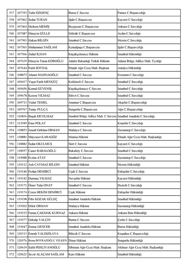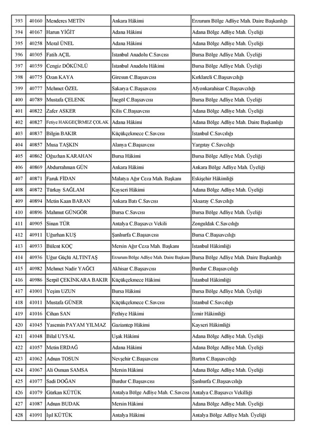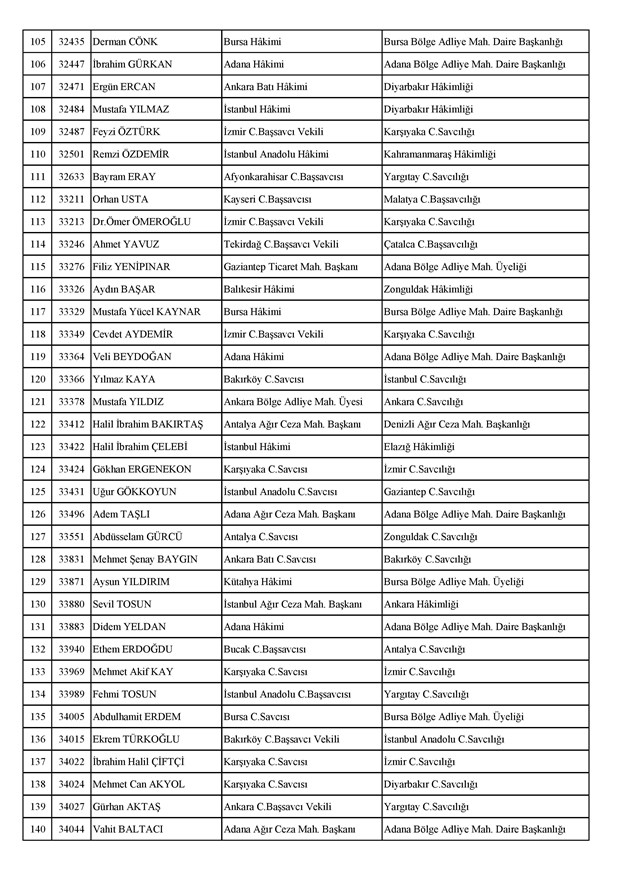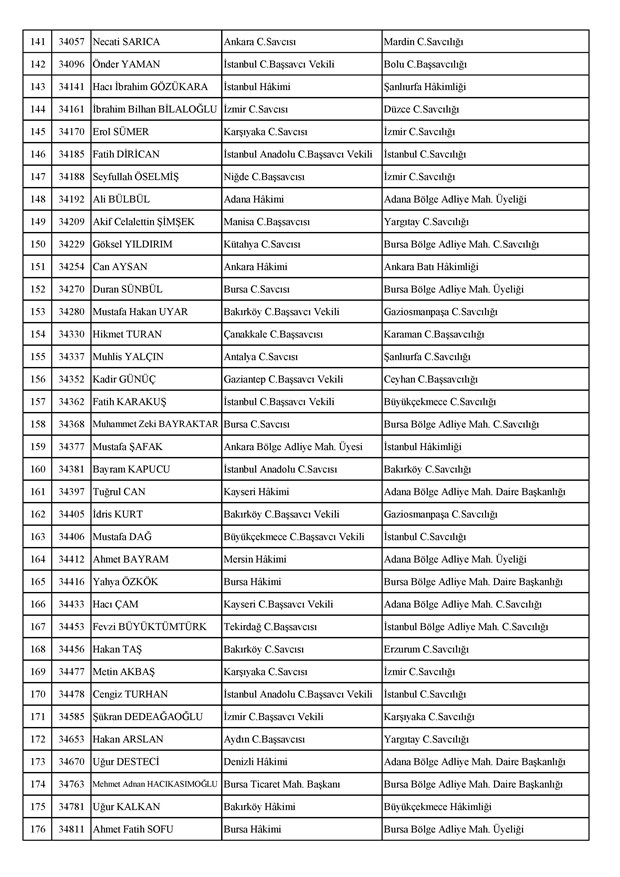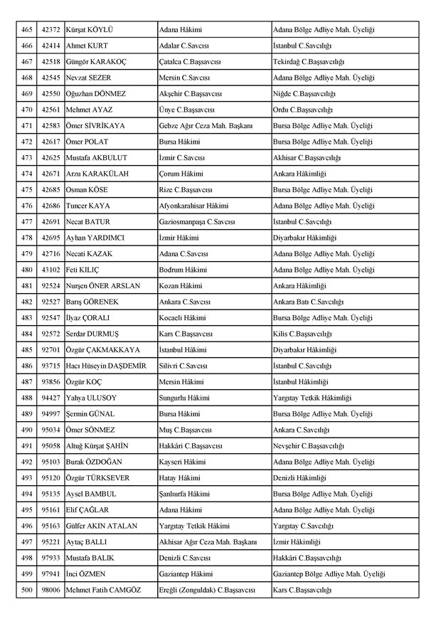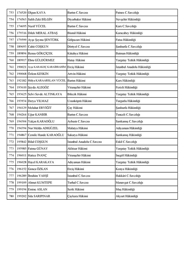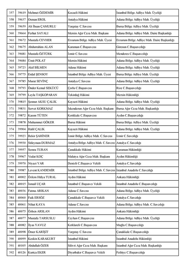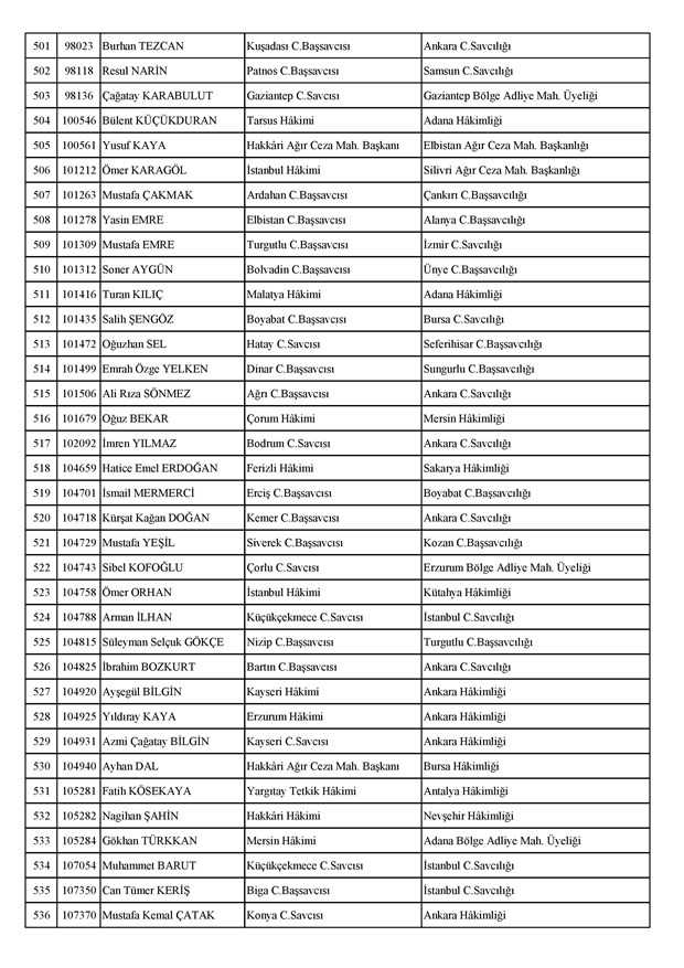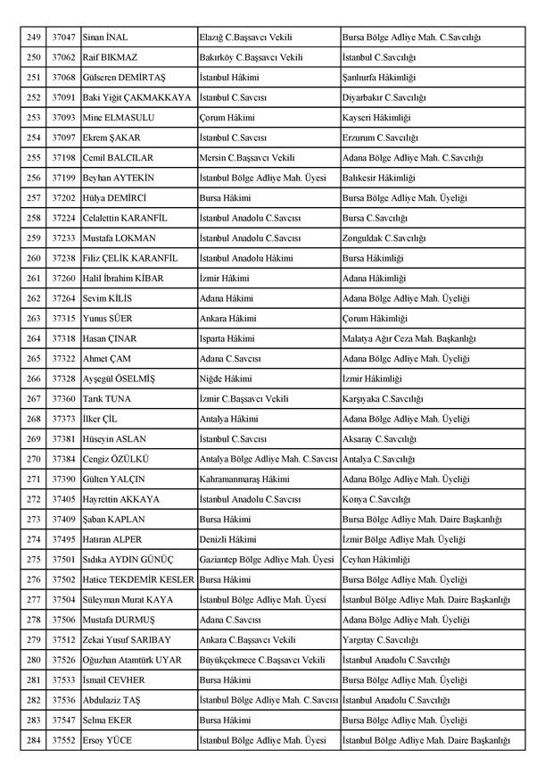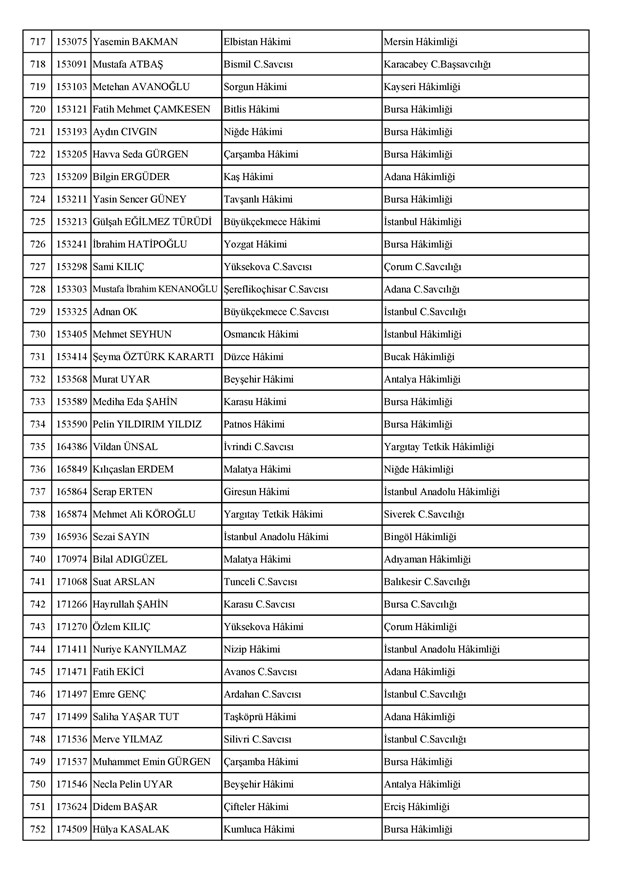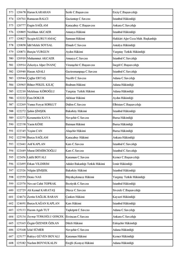 Ataması yapılan meslektaşlarımıza yeni görev yerlerinde başarılar diler, kararnamelerin meslektaşlarımızın ailelerine, yargı teşkilatına ve ülkemize hayırlı olmasını temenni ederiz.'' denildi.İzmir Adliyesi’nde de çok sayıda hakim ve savcının yeri değişirken atamalar sonucu kente yeni isimler görevlendirildi:İzmir Cumhuriyet Başsavcı Vekili Emin Atik Karşıyaka Cumhuriyet Savcılığı’naİzmir Cumhuriyet Başsavcı Vekili Feyzi Öztürk Karşıyaka Cumhuriyet Savcılığı’naİzmir Cumhuriyet Başsavcı Vekili Kadir Karaca Karşıyaka Cumhuriyet Savcılığı’naİzmir Cumhuriyet Başsavcı Vekili Dr. Ömer Ömeroğlu Karşıyaka Cumhuriyet Savcılığı’naİzmir Cumhuriyet Başsavcı Vekili Cevdet Aydemir Karşıyaka Cumhuriyet Savcılığı’naİzmir Cumhuriyet Başsavcı Vekili Şükran Dedeağaoğlu Karşıyaka Cumhuriyet Savcılığı’naİzmir Cumhuriyet Başsavcı Vekili Tarık Tuna Karşıyaka Cumhuriyet Savcılığı’naİzmir Bölge Adliye Mahkemesi Cumhuriyet Başsavcısı Özden Yusuf Kılınç İzmir Cumhuriyet Savcılığı’naİzmir Bölge Adliye Mahkemesi Daire Başkanı Suzan Bayraktaroğlu Evgin İzmir Hakimliği’neİzmir Bölge Adliye Mahkemesi Cumhuriyet Savcısı Sertaç Kaplan İzmir Cumhuriyet Savcılığı’naİzmir Çocuk Ağır Ceza Mahkemesi Başkanı İbrahim Altıntaş Uşak Hakimliği’neİzmir Bölge Adliye Mahkemesi Cumhuriyet Savcısı Mehmet Davran İzmir Cumhuriyet Savcılığı’naİzmir Bölge Adliye Mahkemesi Cumhuriyet Savcısı Raşit Erden İzmir Cumhuriyet Savcılığı’naİzmir Bölge Adliye Mahkemesi Cumhuriyet Savcısı Ali Rıza San İzmir Cumhuriyet Savcılığı’naİzmir Bölge Adliye Mahkemesi Cumhuriyet Savcısı Bekir Şahiner İzmir Cumhuriyet Savcılığı’naİzmir Cumhuriyet Savcısı Adnan Babadağ Kocaeli Cumhuriyet Savcılığı’naİzmir Cumhuriyet Savcısı Talat Kurutan Isparta Cumhuriyet Savcılığı’naİzmir Cumhuriyet Savcısı İbrahim Bilhan Bilaloğlu Düzce Cumhuriyet Başsavcılığı’naKarşıyaka Cumhuriyet Başsavcı Vekili Ali Soylu, İzmir Cumhuriyet Savcılığı’naİzmir Ağır Ceza Mahkemesi Üyesi Melda Şahin Van Ağır Ceza Mahkemesi Üyeliği’neİzmir Bölge Adliye Mahkemesi Üyesi Hülya Güzel İzmir Hakimliği’neMenderes Cumhuriyet Başsavcısı Mert Koparal İzmir Cumhuriyet Savcılığı’naİzmir Cumhuriyet Savcısı Mustafa Öztürk Menderes Cumhuriyet Başsavcılığı’naİzmir Hakimi Hüseyin Koç Hatay Hakimliği’neİzmir Hakimi Yalçın Hayret Mersin Hakimliği’neİzmir Hakimi Halil İbrahim Kibar Adana Hakimliği’neİzmir Hakimi Zeynep Hayret Mersin Hakimliği’neİzmir Hakimi Şehri Kutlar İzmir Bölge Adliye Mahkemesi Üyeliği’neKarşıyaka Cumhuriyet Başsavcı Vekili Mehmet Emin Kavas İzmir Cumhuriyet Savcılığı’naKarşıyaka Cumhuriyet Savcısı Gökhan Ergenekon İzmir Cumhuriyet Savcılığı’naKarşıyaka Cumhuriyet Savcısı Mehmet Akif Kay İzmir Cumhuriyet Savcılığı’naKarşıyaka Cumhuriyet Savcısı İbrahim Halil Çiftçi İzmir Cumhuriyet Savcılığı’naKarşıyaka Cumhuriyet Savcısı Mehmet Can Akyol Diyarbakır Cumhuriyet Savcılığı’naKarşıyaka Cumhuriyet Savcısı Erol Sümer İzmir Cumhuriyet Savcılığı’naİzmir Ağır Ceza Mahkemesi Başkanı Kemal Göker İskenderun Hakimliği’neKarşıyaka Cumhuriyet Savcısı Göksel Eğridere Adana Cumhuriyet Savcılığı’naKarşıyaka Cumhuriyet Savcısı Metin Akbaş İzmir Cumhuriyet Savcılığı’naİzmir Hakimi Berkant Şengel İzmir Bölge Adliye Mahkemesi Daire Başkanlığı’naİzmir Hakimi Çiğdem Kurutan Isparta Hakimliği’ne getirildi.