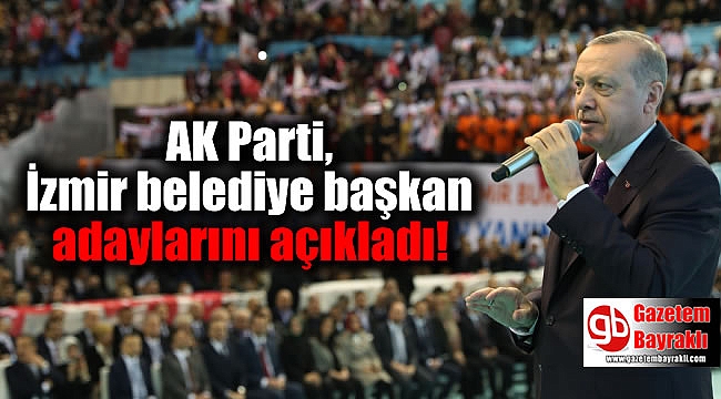 AK Parti’nin belediye başkan adayları 1-İzmir Büyükşehir Belediye Başkan adayı Nihat Zeybekci 2-Bayındır Belediye Başkan adayı Uğur Demirezen 3-Bornova Belediye Başkan adayı Reşat Gençtürk 4-Ödemiş Belediye Başkan adayı Münir Bezmez 5-Karşıyaka Belediye Başkan adayı Ayda Maç 6-Buca Belediye Başkan adayı Mustafa Arslan 7-Gaziemir Belediye Başkan adayı Nazmi Yılmaz 8-Torbalı Belediye Başkan adayı Adnan Yaşar Görmez (mevcut) 9-Güzelbahçe Belediye Başkan adayı Burcu Dereci 10-Bergama Belediye Başkan adayı Hakan Koştu 11-Beydağ Belediye Başkan adayı Ogün Asil Aydoğdu 12-Konak Belediye Başkan adayı Melek Eroğlu 13-Kemalpaşa Belediye Başkan adayı Arif Uğurlu (mevcut) 14-Kiraz Belediye Başkan adayı Saliha Özçınar (mevcut) 15-Menemen Belediye Başkan adayı Durmaz Bayraktar 16-Selçuk Belediye Başkan adayı Osman Başterzi 17-Tire Belediye Başkan adayı Selman İçelli 18-Menderes Belediye Başkan adayı Bülent Soylu (mevcut) 19-Urla Belediye Başkan adayı Adıgüzel Demirel 20-Karaburun Belediye Başkan adayı Ferhan Eroğlu 21-Balçova Belediye Başkan adayı Evrim Özen 22-Bayraklı Belediye Başkan adayı Ali Aslan 23-Çiğli Belediye Başkan adayı Okan Korkmaz 24-Kınık Belediye Başkan adayı Sadık Doğruer (mevcut) 25-Karabağlar Belediye Başkan adayı Bilal Doğan 26-Seferihisar Belediye Başkan adayı Hamit Nişancı MHP’nin belediye başkan adayları 1-Narlıdere Belediye Başka adayı Süleyman Kocabıyık 2-Aliağa Belediye Başka adayı Serkan Acar (mevcut) 3-Dikili Belediye Başka adayı Buğra Akın 4-Çeşme Belediye Başka adayı Sema Aydın 5-Foça Belediye Başka adayı Serdar Mersin