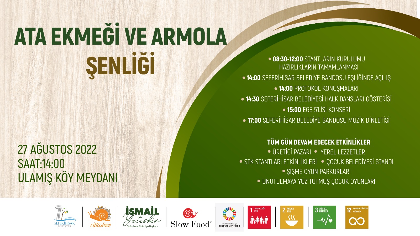 Sağlıklı bir yaşam ve huzurun adresi Ulamış köyünde bir yıl aradan sonra “Ata ekmeği ve Armola Şenliği” misafirlerini yeniden ağırlayacak. Şenlik kapsamında kurulacak üretici pazarlarında Seferihisar bölgesinin yerel ürünleri satışa sunulacak, yerel lezzetler ikram edilecek.  Seferihisar Bandosu ve Ege 5’lisinin müzik ziyafeti sunacağı şenlikte özel çocuk etkinlikleri de gerçekleştirilecek. Unutulmaya yüz tutmuş çocuk oyunları, şişme oyun parkurları minik ziyaretçilere de unutulmayacak bir gün yaşatacak.