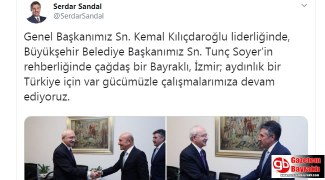 Serdar Sandal sosyal medya hesabından; ''Genel Başkanımız Sn. Kemal Kılıçdaroğlu liderliğinde, Büyükşehir Belediye Başkanımız Sayın Tunç Soyer’in rehberliğinde çağdaş bir Bayraklı, İzmir; aydınlık bir Türkiye için var gücümüzle çalışmalarımıza devam ediyoruz.'' açıklamasında bulundu.
