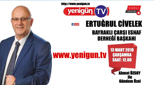 Bayraklı Çarşı Esnaflar Derneği Başkanı, Gazetem Bayraklı ‘nın imtiyaz sahibi Ertuğrul Civelek 13 Mart Çarşamba Günü saat: 12.00'da www.yenigun.tv'de Ahmet Özsoy ile Gündem Özel programına konuk olacak.