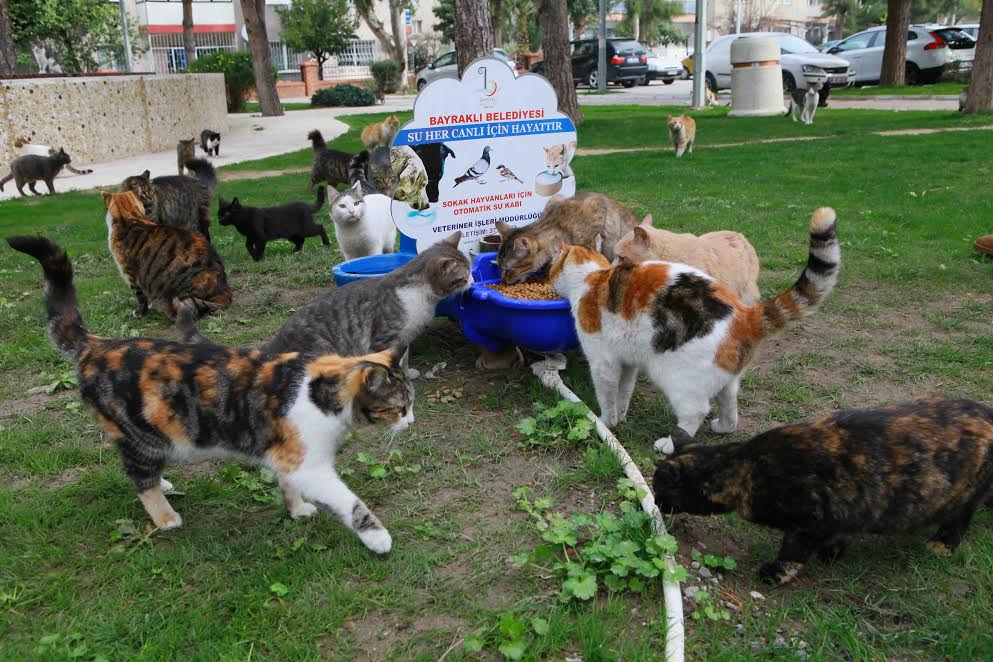 Yaz aylarındaki kavurucu sıcaklarda su bulmakta zorlanan sokak hayvanları için ilçenin farklı noktalarına otomatik su kapları yerleştiren Bayraklı Belediyesi, bu sayıyı artırırken, zarar görenleri de yeniledi.