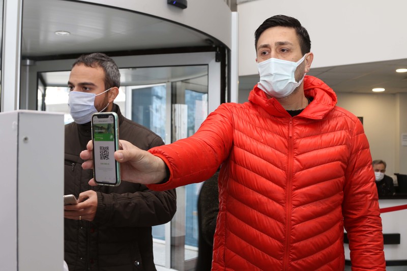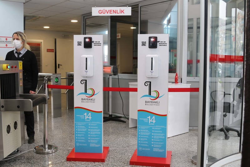 Pandemi sürecinde halk sağlığı için ilçenin her noktasında ve hizmet binalarının girişlerinde ateş ölçüp, hijyen ve maske konularında tedbir alan Bayraklı Belediyesinde, vatandaşların beklemeden hızla hizmet alabilmesi için dijital HES kodu sorgulama ve ateş ölçme cihazları hizmete sunuldu.