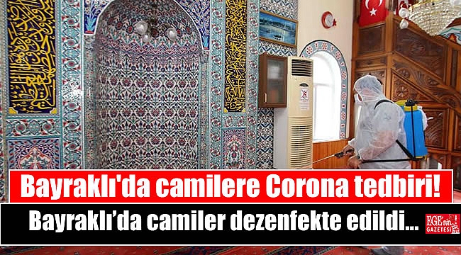 Coronavirüs salgını dolayısıyla ülke genelinde bir süredir toplu ibadete kapalı olan camiler, cuma namazı öncesi Bayraklı Belediyesi ekiplerince dezenfekte edildi. Bayraklı Belediyesi Temizlik İşleri Müdürlüğü ekipleri, camilerin halı, kapı ve duvarları ile imam ve müezzinin kullandığı alanlar, tesbihler, ayakkabılıklar, musluklar, tuvaletler, banklar gibi temasın olabileceği her yeri en ince ayrıntısına kadar ilaçladı.Çalışmalar, ilçede bulunan 58 caminin tamamında yürütülürken; bunlardan 25’inin ibadete açılacağı belirtildi. Genelgeye göre sadece bahçesi, avlusu olan ve çevresi sosyal mesafe kuralına uygun camilerde cuma namazı kılınabilecek. Cemaatle birlikte yalnızca öğle, ikindi ve cuma namazları kılınacak. Diğer vakitlerde bireysel olarak ibadet etmek isteyen vatandaşlar için ise cami ve mescitler açık olacak.