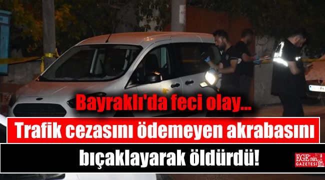 İzmir'in Bayraklı ilçesinde Servet B. (32), emanet verdiği otomobili ile seyahat ederken trafik cezası kesilen ve parayı ödemeyen akrabası Yavuz Demir'i (27), çıkan tartışmanın ardından bıçaklayarak öldürdü.Olay, saat 02.00 sıralarında Dünya Barış Anıtı yakınındaki 7171 sokakta meydana geldi. Servet B., bir süre önceihtiyacı olduğunu belirten akrabası Yavuz Demir'e otomobilini emanet verdi. Otomobilin Yavuz Demir'de olduğu süre içeresinde, trafik kurallarını ihlal etmek suçundan yaklaşık 500 lira trafik cezası yazıldı. Bunun üzerine Servet B., telefonla durumu anlattığı akrabası Demir'e cezanın otomobilin kendisinde olduğu süre içerisinde kesildiğini belirterek, pyarasını ödemesini istedi. Demir ceza parasını ödemeyeceğini söylemesi üzerine, ikili arasında sözlü tartışma çıktı.EVİNE GİTTİ, KAVGA SIRASINDA BIÇAKLANDITelefondaki tartışma karşılıklı hakarete dönüşünce Yavuz Demir, 2 çocuk babası Servet B.'nin oturduğu eve gitti. Gerginliğin devam etmesi sonucu, iki akraba sokak ortasında kavga etti. Bu sırada, iddiaya göre Servet B. yanında getirdiği bıçak ile Yavuz Demir'i yaraladı. bıçakladı. Demir kanlar içerisinde yere yığılırken, Servet B. ise olay yerinden kaçtı.çevredekiler durumu polis ve sağlık ekiplerine haber verirken, kısa süre sonra yaralı Demir'in ağabeyi olay yerine geldi. Ağabeyi, sağlık ekibini beklemeden kardeşini özel bir hastaneye götürdü. Tedaviye alınan 1 çocuk babası Yavuz Demir, yapılan müdahalelere rağmen kurtarılamadı. Yavuz Demir'in cansız bedeni, savcının incelemesinin ardından İzmir Adli Tıp Kurumu morguna kaldırıldı.Bayraklı İlçe Emniyet Müdürlüğü ekipleri, olaydan sonra kaçan Servet B.'yi kısa sürede yakaladı. Gözaltına alınan Servet B., emniyete götürüldü. Servet B.'nin ifadesinde, akrabası olan Yavuz Demir'e bir süre önce otomobilini verdiğini ve bu süre içerisinde trafik cezası kesildiğini, bu parayı ödemesini istediğinde ise tartıştıklarını söylediği öğrenildi.Olayla ilgili başlatılan soruşturma sürüyor.