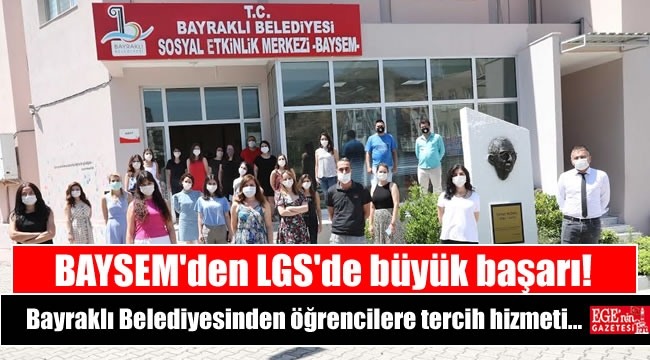 Bayraklı Belediyesi Sosyal Etkinlik Merkezi BAYSEM'de eğitim alarak Liselere Giriş Sınavı'nda (LGS) üstün başarı gösteren 300 öğrencinin 210'u, sınav sonuçlarına göre başarılı oldu. Öğrenciler, Türkiye genelinde nitelikli lise ve mesleki teknik liselerde eğitim alma hakkı kazandı. BAYSEM eğitmenleri de tüm öğrencilerin en doğru tercihleri yapması için rehberlik hizmeti vermeye başladı.