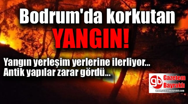Muğla’nın Bodrum ilçesinde makilik alanda başlayan ve ardından tarım arazilerine sıçrayan yangın yerleşim alanlarına doğru ilerliyor.Edinilen bilgiye göre, bugün saat 15.30 sıralarında Bodrum’un Gümbet Mahallesi Göktepe mevkiinde bulunan otluk ve makilik alanda henüz belirlenemeyen bir nedenle yangın çıktı. Şiddetli rüzgarın da etkisiyle radyo-televizyon ve GSM vericilerine doğru ilerleyen yangına Muğla Orman Bölge Müdürlüğü ile Muğla Büyükşehir Belediyesine bağlı çok sayıda ekip ile müdahale ediliyor.Şiddetli rüzgar nedeniyle zaman zaman alevlerin boyu metrelerce yüksekliğe ulaşıyor. Yangın nedeniyle duman altına kalan Bodrum’da, trafik akışı güvenlik güçleri tarafından kontrollü olarak sağlanıyor. Elektrik direklerinin yanması nedeniyle, kentin bazı bölgelerine enerji verilemiyor. İtfaiye ekipleri, araç girişine uygun olmayan yamaca karayolu kenarından hortumlarla müdahale etmeye çalışıyor.Çok sayıda antik mezar ile tarihi kalıntıların zarar gördüğü yangın Bodrum Devlet Hastanesi ile tarihi Bodrum Antik Tiyatrosunu tehdit etmeye başladı. Makilik alanda başlayarak tarım arazilerine sıçrayan yangında şuana kadar 6 hektar alanın zarar gördüğü belirtildi.