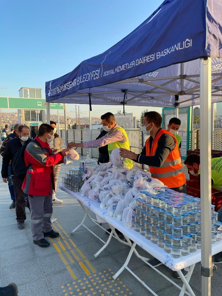 Kent dayanışmasını Ramazan ayına da taşıyan İzmir Büyükşehir Belediyesi; Halkapınar, Konak ve Üçyol metro istasyonlarında iftar saatinde yolda olanlar için bin 500 kişilik kumanya dağıttı. Ayrıca 8 ilçeye 15 bin kişilik iftar yemeği ulaştıran Büyükşehir, Ramazan ayının başından bu yana sofralara toplamda 158 bin 220 kişilik iftar yemeği koydu.