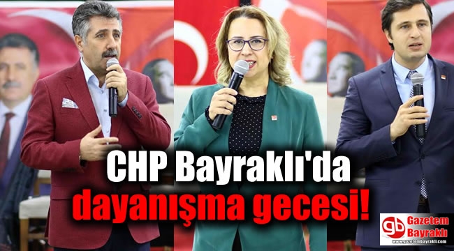Gece de konuşan CHP İlçe Başkanı Pınar Susmuş, "'Güçlü örgüt, güçlü belediye' diyerek, çıktığımız bu yolda her daim başarıyı yakalayacağız. Çünkü arkamızda partisine, davasına inanmış, mücadele ruhuyla dolu büyük bir çoğunluk var. Bu birlikteliği büyüteceğiz" dedi. Etkinliğe Cumhuriyet Halk Partisi İzmir İl Başkanı Deniz Yücel, Bayraklı Belediye Başkanı Serdar Sandal, meclis üyeleri, eski bakanlardan Yaşar Okuyan ve CHP il, ilçe yöneticileriyle kongre delegeleri katıldı.Cumhuriyet Halk Partisi Bayraklı ilçe örgütü, CHP İl Başkanı Deniz Yücel, il, ilçe yöneticileri, il kongre delegeleri, Bayraklı Belediye Başkanı Serdar Sandal ve meclis üyeleri dayanışma gecesinde bir araya geldi. Etkinlikte Bayraklı'da birlik, beraberlik ve dayanışmanın her zaman devam edeceği vurgulandı.