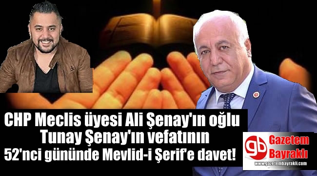 Cumhuriyet Halk Partisi Meclis üyesi Ali Şenay'ın talihsiz kaza sonrası hayatını kaybeden biricik oğlu Tunay Şenay'ın vefatının 52’inci günü nedeniyle 13 Ocak 2019 Pazar günü öğle namazından sonra Mevlüt'ü okunacaktır.