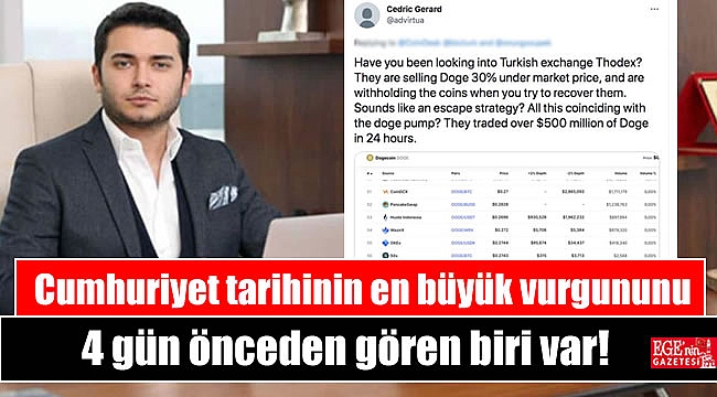 Sosyal medya kullanıcısı, tweetinde, "Türk borsası Thodex'i inceliyor musunuz? Dogecoin'i yüzde 30 piyasa fiyatının altında satıyorlar ve onları geri almaya çalıştığınızda paraları alıkoyuyorlar. Bir kaçış stratejisine benziyor mu? Bütün bunlar Dogecoin pompasına denk geliyor mu? 24 saat içinde 500 milyon doların üzerinde Dogecoin ticareti yaptılar" ifadelerini kullandığı ortaya çıktı.