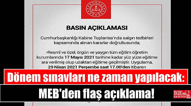 - Okullarda 3 Mayıs 2021 sonrasından yapılması planlanan dönem sınavları, 17 Mayıs 2021 tarihi sonrasına ertelenmiştir."
