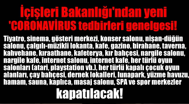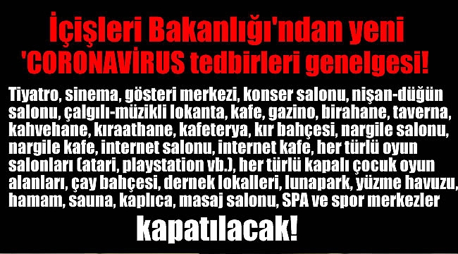 Çin'in Vuhan kentinde başlayarak tüm dünyayı tehdit eden ve Dünya Sağlık Örgütü tarafından pandemi olarak nitelendirilen Coronavirüs salgınından vatandaşları korumak ve salgının yayılmasını engellemek amacıyla önlemler alınmaya devam ediyor.Bu kapsamda, Sağlık Bakanlığı ile yapılan değerlendirmeler sonucunda İçişleri Bakanlığı tarafından ek bir genelge 81 il valiliklerine gönderildi.Genelgeye göre, "umuma açık istirahat ve eğlence yerleri olarak faaliyet yürüten ve vatandaşların çok yakın bir mesafede bir arada bulunarak hastalığın bulaşma riskini arttıracağı gerekçesiyle, tiyatro, sinema, gösteri merkezi, konser salonu, nişan-düğün salonu, çalgılı-müzikli lokanta, kafe, gazino, birahane, taverna, kahvehane, kıraathane, kafeterya, kır bahçesi, nargile salonu, nargile kafe, internet salonu, internet kafe, her türlü oyun salonları (atari, playstation vb.), her türlü kapalı çocuk oyun alanları (alışveriş merkezi ve lokanta içindekiler dahil), çay bahçesi, dernek lokalleri, lunapark, yüzme havuzu, hamam, sauna, kaplıca, masaj salonu, SPA ve spor merkezlerinin faaliyetleri" geçici bir süreliğine bugün saat 00.00 itibarıyla durdurulacak.Sivil Toplum Kuruluşlarının (dernek, vakıf) genel kurulları ve sivil toplum kuruluşlarının eğitimleri dahil, insanları toplu olarak bir araya getiren her türlü toplantı ve faaliyetleri, icrai zorunluluk gerektiren yönetim faaliyetleri hariç, saat 00:00 itibarıyla geçici olarak ertelenecek.Toplu olarak vatandaşların bir arada bulunduğu taziye evlerinin faaliyetleri de saat 00.00 itibarıyla durdurulacak.Bakanlık, söz konusu bu tedbirlere ilişkin vali, kaymakamlar tarafından il, ilçe belediyeleri ile iş birliği içinde ilgili kanun hükümleri çerçevesinde gerekli tedbirlerin ivedilikle planlanması, uygulanması ve kolluk birimleri tarafından konunun takip edilerek uygulamada herhangi bir aksaklığa meydan verilmemesini istedi.