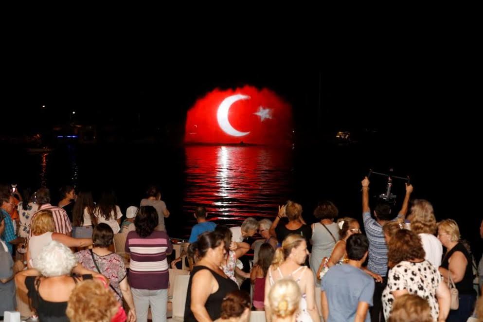 4 D ve havai fişek gösterisi coşkuyu zirveye ulaştırdıCoşkulu konserin ardından ise deniz içinde oluşturulan su perdesine yansıtılan Türk Bayrağı ve Atatürk hakkında hazırlanmış kısa film gösterisi coşkuyu zirveye ulaştırdı. Su içindeki gösteri sırasında çalan İzmir Marşı ve 10. Yıl Marşı’na sahildeki yüzlerce kişi eşlik etti. Gecenin sonunda gerçekleştirilen havai fişek gösterisi ise unutulmaz anlar yaşanmasına neden oldu.
