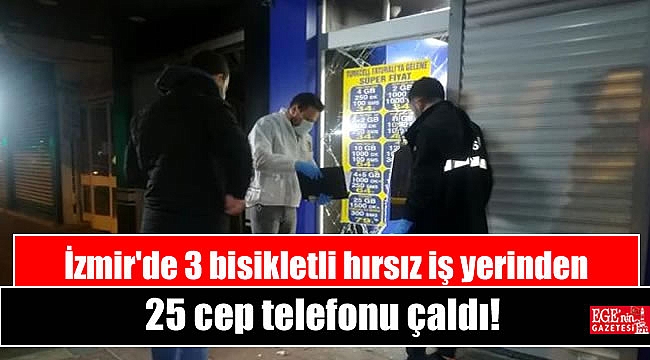 İzmir'in Konak ilçesinde, 3 şüpheli tarafından bir telefoncu dükkanından gerçekleşen hırsızlıkta, yaklaşık 25 cep telefonu ve bir miktar para çalınırken, kaçan şüpheliler kısa sürede polis ekiplerince malzemeler ile birlikte yakalandı.Olay, gece saatlerinde Güzelyalı Mahallesi Mithatpaşa Caddesi üzerinde bulunan bir telefoncu dükkanında meydana geldi. İddiaya göre İzmir Büyükşehir Belediyesi'ne ait Akıllı Bisiklet Kiralama Sistemi (Bisim) kullanarak yanlarındaki taşlar ile telefoncu dükkanı önüne gelen 3 şüpheli, taşları telefoncu dükkanının camlarına atarak kırdı. İçeri giren hırsızlar, yaklaşık 25 telefon ve kasada bulunan bir miktar parayı çaldı.Bisikletleri ve bazı telefonları sokaklara attılarOlayın ardından kaçan şüpheliler, çaldıkları telefon ve paralardan bir miktarını düşürürken, çevredeki vatandaşların ihbarı üzerine adrese çok sayıda polis ekibi sevk edildi. Ekipler tarafından şahısları yakalamak için başlatılan çalışmalar neticesinde, şüphelilerin bisikletler ile bazı telefon ve bir miktar paraları sokaklara attıkları belirlenirken, şüpheliler ekipler tarafından çaldıkları malzemeler ile birlikte kısa sürede yakalandı.Olayı gören ve polise ihbar eden M.G., 3 şahsın camı kırarak içeri girdiğini belirterek, "Olayı duyduktan hemen sonra polise ihbarda bulunduk. Biz polisi arayıp dışarı çıkana kadar 25 adet cep telefonu çalıp kaçmışlar" dedi. Kaynak: İhlas Haber Ajansı / MUSTAFA İÇ