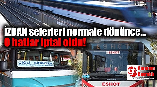 İzmir Büyükşehir Belediyesi, İZBAN'daki grevin sona ermesinin ardından, geçici olarak oluşturulan otobüs ve minibüs hatlarının yarından itibaren (9 Ocak Çarşamba) seferden kaldırılacağını duyurdu. ESHOT otobüsleriyle minibüsler, grev öncesindeki normal işletim sistemine dönecek.İZBAN çalışanlarının geçtiğimiz Aralık ayında başlattığı grev sürecinde İzmirlilerin mağduriyet yaşamaması adına yeni otobüs hatları düzenleyen ve İZBAN güzergahı boyunca ilave minibüs hatları oluşturan İzmir Büyükşehir Belediyesi, grevin sona ermesiyle birlikte normal çalışma düzenine dönüyor. Banliyö sisteminin yeniden işletime geçmesi nedeniyle, ESHOT Genel Müdürlüğü tarafından geçici olarak oluşturulan 773 numaralı Torbalı (Tepeköy Aktarma)-ESBAŞ Aktarma, 843 numaralı Aliağa Aktarma-Egekent Aktarma, 844 numaralı Egekent Aktarma-Bornova Metro ve 856 numaralı Çiğli Aktarma -Alsancak Gar hatları iptal ediliyor. ESHOT, yarından (9 Ocak Çarşamba) itibaren grev öncesi işletim düzeni ile hizmet vermeye devam edecek.Öte yandan, İZBAN grevinde vatandaşların mağduriyetini ortadan kaldırabilmek amacıyla yine Büyükşehir Belediyesi tarafından geçici olarak oluşturulan minibüs hatları da yarından itibaren kaldırılacak.