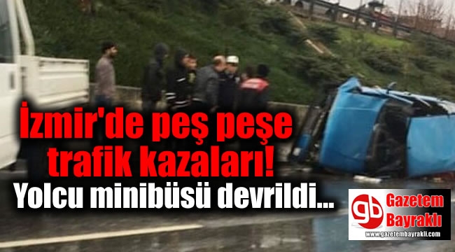 İzmir'e kuvvetli yağış için Meteoroloji'den uyarı gelmişti. Etkili yağış altında olan İzmir'de peş peşe trafik kazaları trafikte zor anlara neden oldu. Menemen minibüsü devrilirken Yeşildere Caddesi'nde de otomobil kayarak kaza yaptı.Dün saat 13.30 sıralarında, Menemen-İzmir seferini yapan Vedat Y. yönetimindeki 35 MSH 62 plakalı yolcu minibüsü, Meles Deltası yakınlarında sürücünün direksiyon kontrolünü yitirmesiyle devrildi. Sürücü Vedat Y. ve minibüsteki 3 yolcu hafif yaralandı. Kazanın bildirilmesi üzerine gelen sağlık ekipleri, yaralıları ambulansla çevredeki hastanelere kaldırdı. Yaralılar, tedavilerinin ardından taburcu edilirken, kaza nedeniyle Altınyol Caddesi'ndeki araç trafiğinde yoğunluk yaşandı.