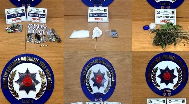 İzmir'de bir hafta içerisinde polis ekipleri tarafından gerçekleştirilen uyuşturucu operasyonlarında çok sayıda uyuşturucu madde ele geçirilirken, olaylarla ilgili 59 şüpheli hakkında işlem yapıldı; 15 şüpheli tutuklandı.İzmir'de bir hafta içerisinde polis ekipleri tarafından gerçekleştirilen uyuşturucu operasyonlarında çok sayıda uyuşturucu madde ele geçirilirken, olaylarla ilgili 59 şüpheli hakkında işlem yapıldı; 15 şüpheli tutuklandı.İzmir İl Emniyet Müdürlüğü Narkotik Suçlarla Mücadele Müdürlüğü ekipleri, 14 - 20 Haziran tarihleri arasında kent genelinde çok sayıda operasyon ve uygulama gerçekleştirdi. Ekipler tarafından gerçekleştirilen aramalarda 124 gram esrar-skank, 4 gram kokain, 6 gram eroin, 17 kök kenevir, 11 gram sentetik kannabinoid, 233 gram metamfetamin, 181 adet ecstasy maddesi, 623 adet sentetik ecza maddesi, 10 adet captagon, 6 tabanca 2 tüfek, 6 şarjör, 143 adet fişek ele geçirildi.Olaylarla ilgili 59 şüpheliye işlem gerçekleştirilirken, emniyetteki işlemleri tamamlanarak adliyeye sevk edilen şüphelilerden 15'i tutuklandı; 8 şüpheli ise adli kontrol şartıyla serbest bırakıldı.(İHA)Kaynak: İhlas Haber Ajansı