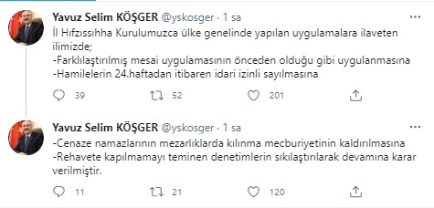 Cumhurbaşkanı Recep Tayyip Erdoğan tarafından kademeli normalleşme adımları açıklandı. İzmir Valisi Yavuz Selim Köşger’de yüksek riskli iller arasında bulunan İzmir’de alınan yeni tedbirleri sosyal medya hesabı üzerinde paylaştı.Köşger, Twitter hesabından yaptığı açıklamada şu ifadelere yer verdi;“İl Hıfzıssıhha Kurulumuzca ülke genelinde yapılan uygulamalara ilaveten ilimizde; -Farklılaştırılmış mesai uygulamasının önceden olduğu gibi uygulanmasına-Hamilelerin 24.haftadan itibaren idari izinli sayılmasına-Cenaze namazlarının mezarlıklarda kılınma mecburiyetinin kaldırılmasına-Rehavete kapılmamayı teminen denetimlerin sıkılaştırılarak devamına karar verilmiştir”