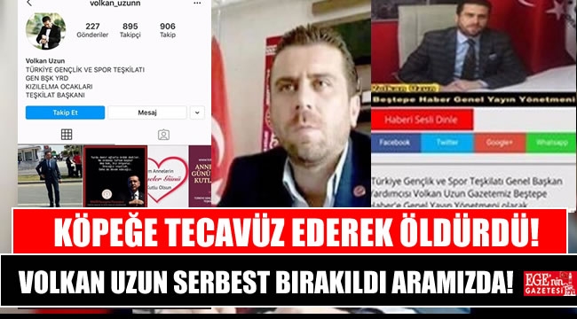 Ankara'da TÜRKİYE GENÇLİK SPOR TEŞKİLATI GENEL BAŞKAN YARDIMCISI, Bestepehaber.com genel yayın yönetmeni ve Kızılelma Ocakları Teşkilat Başkanı Volkan Uzun isimli şahıs bakması için kendine emanet edilen köpeğe tecavüz ederek ölümüne sebep oldu.Arkadaşının cenazeye gitmek için bakması üzerine bıraktığı Köpeğe tecavüz eden Volkan Uzun, arkadaşının komşularının arkadaşına haber vermesi üzerine köpeğin acı içinde bağırmasıyla ortaya çıktı. Köpek olay yerinde ölü ve kanlar içinde bulunurken, köpeğe tecavüz etmekle suçlanan şahıs, olayın duyulmasının ardından Twitter'da gündem olurken gözaltına alınmasının ardından serbest bırakıldı.İLKELERİMİZ GEREĞİ MELEK OLAN KÖPEĞİN FOTOĞRAFINI KOYAMIYORUZ...