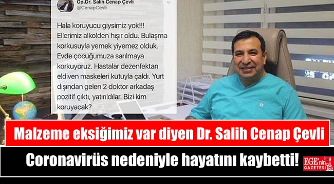 Genel Cerrahi Uzmanı Dr. Salih Cenap Çevli, koronavirüs nedeniyle hayatını kaybetti.Çevresinde çok sevilen, hastayken dahi Twitter hesabından hastalık ile ilgili bilgiler veren doktor Cenap Çevli’nin ölümü üzüntü yarattı.MALZEME EKSİĞİNDEN BAHSETMİŞ...Genel Cerrahi Uzmanı Dr. Salih Cenap Çevli,Twitter hesabından koruyuvcu giysilerinin olmadığından ve coronavirüsün bulaşma riskinin olduğundan bahseden doktor maalesef coronadan hayatını kaybetti.