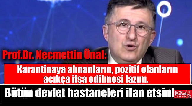 Tüm dünyayı etkisi altına alan koronavirüs ile mücadele etmenin en zorlu kısımlarından biri de hastaların karantinayı delerek sokağa karışması. Bu konunun altını çizen Ankara Üniversitesi Öğretim Üyesi Prof. Dr. Necmettin Ünal, koronavirüsle mücadelede şeffaf olunması gerektiğini belirterek, “Karantinaya alınanların, testi pozitif olanların açıkça ifşa edilmesi lazım. Bütün devlet hastaneleri ilan etsin” dedi.