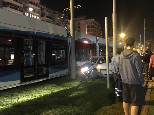 Büyükşehir Belediyesi'nin yapımını tamamladıktan sonra ücretsiz deneme seferlerini yapan tramvay, saat 23.00 sıralarında yolcusuz olarak seferlerini sürdürdü. Bu sırada Karşıyaka nikah salonu önünde B.Y. yönetimindeki otomobil tramvaya çarptı.
