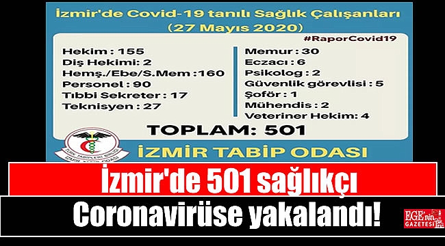 İzmir Tabip Odası, 27 Mayıs 2020 tarihi itibarı ile Corona virüs (Covid-19) tespit edilen sağlık çalışanları sayısını açıkladı. Yayınlanan rapora göre korona virüs tanısı konan sağlık çalışanlarının sayısının 501'e çıktığı öğrenildi. Korona virüs tanısı konan sağlık çalışanları arasında 2’si diş 4’ü veteriner olmak üzere toplam 155 hekim bulunduğu açıklandı.