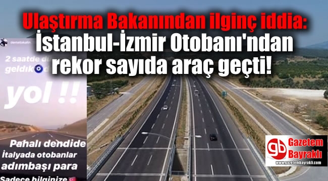Cumhuriyet tarihinin en büyük projeleri arasında yer alan İstanbul-İzmir Otobanı'ndan rekor araç geçti. Bayram süresince garanti verilenin üç katı araç yolu kullandı.Kurban Bayramı'ndan hemen önce açılışı gerçekleştirilen otobandan geçiş, garanti sayısının 3 katına ulaştı.Ulaştırma ve Altyapı Bakanı Cahit Turhan, İstanbul-İzmir Otoyolu'nun kullanımına ilişkin verileri paylaştı.Turhan açıklamasında "Tüm etapları ile ilk defa Kurban Bayramı'nda kullanılan İstanbul-İzmir Otoyolu, verilen garanti geçiş sayılarının yaklaşık 2,5 -3 katı kadar araç tarafından kullanılmıştır. Örneğin 9 gün boyunca sadece Osmangazi Köprüsü'nden 353 bin 739 araç geçmiştir. Osmangazi Köprüsünde garanti edilen araç sayısı 40 bin. 10 Ağustos'ta 60 bin, 11 Ağustos'ta, 34 bin, 12 Ağustos'ta 36 bin, 13 Ağustos'ta 34 bin, 14 Ağustos'ta 41 bin, 15-16 Ağustos'ta 34 bin, 17-18 Ağustos'ta ise 41 bin seviyelerinde geçiş gerçekleşti. Diğer kesimlerde de garanti edilen miktarların yüzde 50 fazlasını geçmiş durumdadır. Otoyolun tüm kesimlerinden ise ayrı ayrı olarak 9 günde geçen araç sayısı tam olarak 1 milyon 745 bin 614'ü buldu. Böylece sırf muhalefet olmak için bu dev projeye karşı çıkanlara en iyi yanıtı vatandaşlarımız vermiş oldu" dedi.GERÇEKTEN REKOR MU?İstanbul-İzmir Otoyolunu deneyen sürücülerin paylaştıkları videolarda yolun boş olduğu gözüküyor. Son olarak bayramda otoyolu 2 saatte gittiğini iddia eden Şarkıcı Demet Akalın'ın paylaştığı videoda da yolun bomboş olduğu görülüyor.